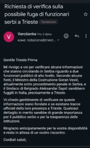 Nakon što sam objavila predhodni tekst o glasinama koje kruže po Srbiji da se Goran Vesić, bivši ministar građevine i Aleksandar Šapić, gradonačelnik Beograda, nalaze u Trstu , i nakon što sam poslala upit italijanskim medijima sa molbom da provere ove navode, stigao je i odgovor sa svih strana.