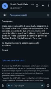 Odgovor italijanskog izvora sugeriše da vlasti u Trstu nemaju konkretne informacije o prisustvu traženih osoba u tom gradu. Jedini relevantan događaj koji se pominje je susret prefekta Trsta i konzula Srbije, što može, ali ne mora biti povezano.